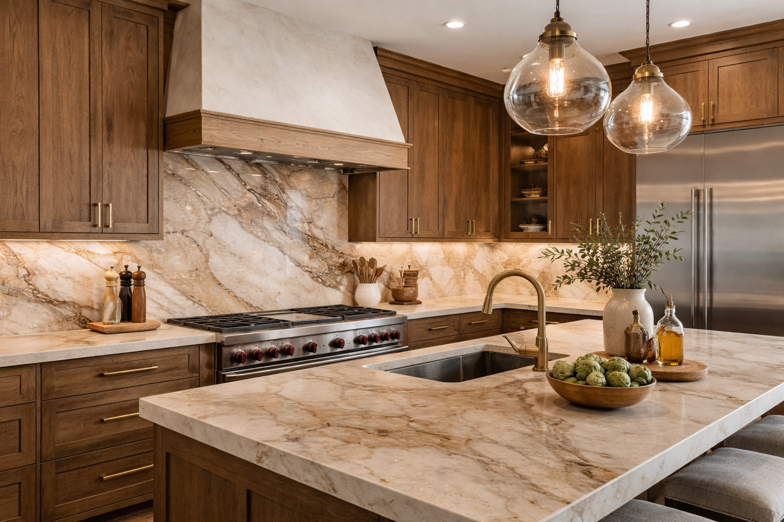 Quartzite and marble-look surfaces remain especially desirable in high-end properties.