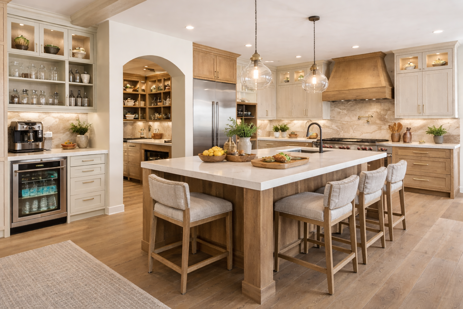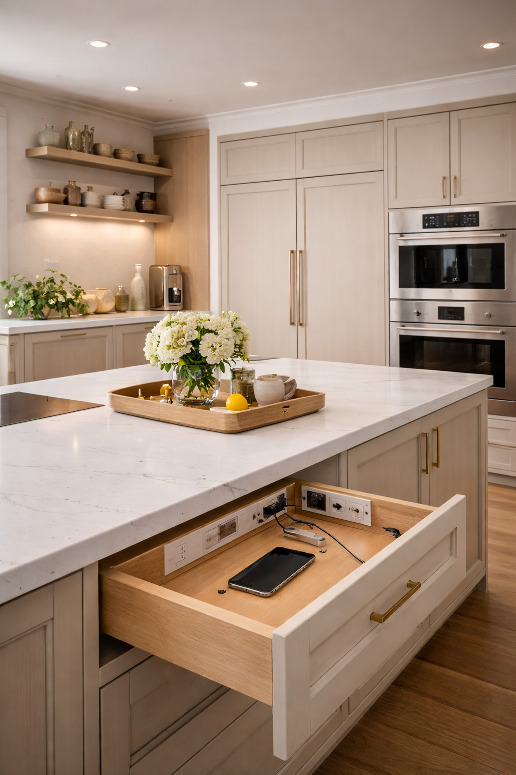 Panel-ready appliances and hidden charging stations maintain clean design while adding function.