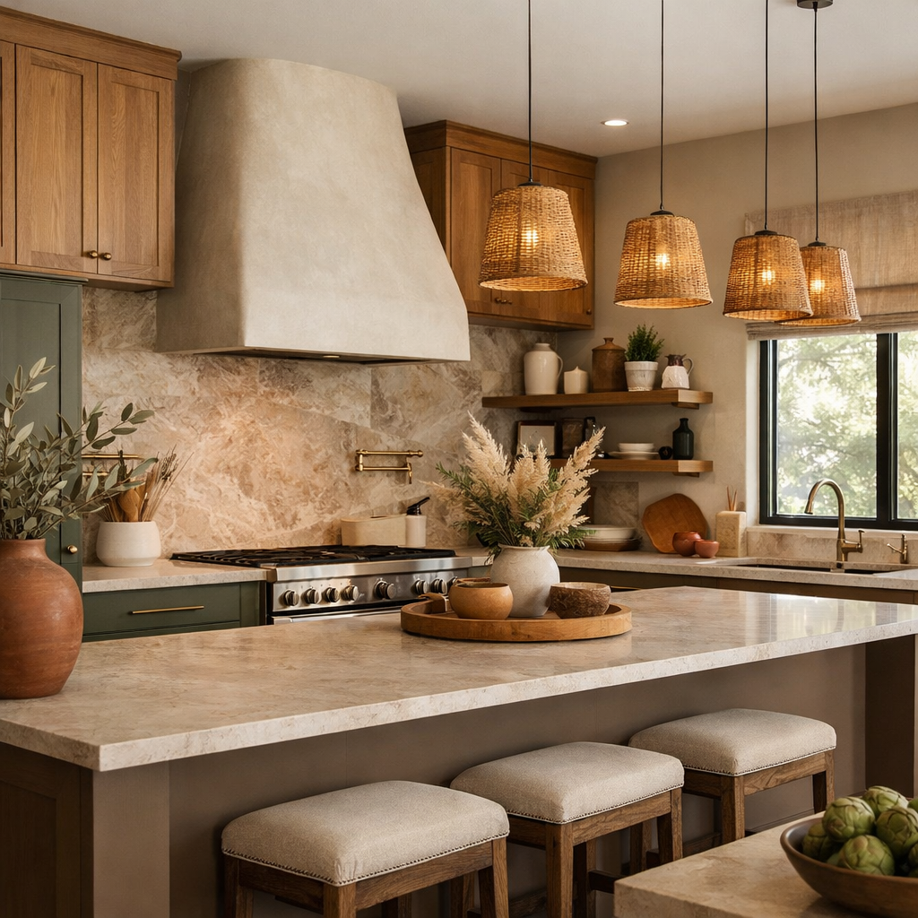 Bright white kitchens are becoming less dominant. Designers are shifting toward warmer, nature-inspired tones such as taupe, soft cream, olive green, and clay.